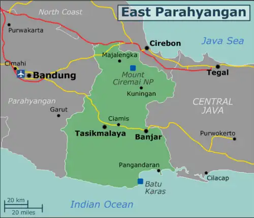 As the name implies, East Parahyangan is the eastern continuation of the mountain region of Parahyangan, which is centred around the city of Bandung. The volcanic mountain region of East Parahyangan includes the regencies of Tasikmalaya, Ciamis, Kuningan, Majalengka (the mountainous part), and Pangandaran, as well as the independent cities of Tasikmalaya and Banjar.