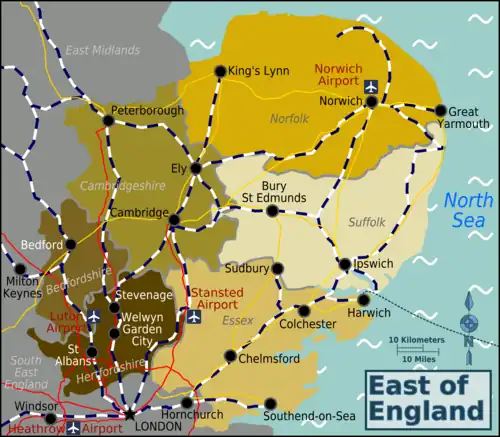 - past Peterborough, Wisbech, King's Lynn, Norwich, Great Yarmouth and Lowestoft from the Midlands including Leicester.