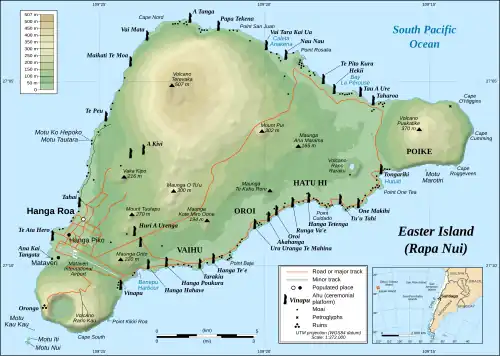 The island is roughly triangular in shape, with sides of 16, 17 and 24 km long. Formed through volcanic activity, the three corners of the island are inactive volcanoes. In the north is Maunga Terevaka, the highest point of the island rising 511 m above sea level. The eastern corner is Puakatiki, 377 m ASL and the main volcano of the island. Finally, in southwest Rano Kau with a height of 324 m. Other important hills are Rano Aroi and Rano Raraku.