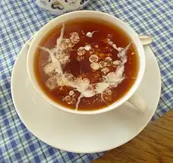 While coffee dominates the surrounding regions, East Frisia's strong tea culture is considered part of Germany's intangible cultural heritage. The German Records Institute says the region has the highest tea consumption rate in the world, and many residents drink tea multiple times per day. Hot black tea here is drunk rather ceremonially, with rock candy sugar (kluntje) sitting in the bottom of the cup and with whipping cream poured on top. This is left unstirred, so the cup of tea starts out mild and creamy, becomes clear and flavorful, and finishes with a sweet taste. When you've had enough tea, place the spoon in the cup. This is the sign "I don't want any more," because the spoon has no other purpose.