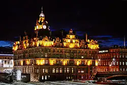 - 🌍 Waldorf Astoria Edinburgh (The Caledonian), Princes Street EH1 2AB, ☏ +44 131 222-8888. Grand hotel presiding over the west end of Princes St, facing the castle. It was built as the terminus station and hotel for the Caledonian Railway, vying with the rival North British terminus at the east end, now Waverley. The latter became the definitive city terminus, the west end station was demolished in 1970 and "The Caley" was able to expand. Citizens also discovered that it was rose pink, when 70 years of grime was scrubbed off. It earns good but not great reviews for comfort, service and dining in its three restaurants. The property is now owned by an Abu Dhabi holding company but continues to be operated by Hilton. B&B double £220.