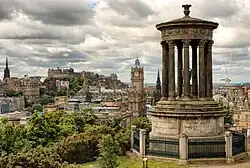 - 🌍 Calton Hill. This is the stubby crag just east of Princes Street: a short stroll up it commands great views. The "National Monument", a memorial to Scots killed in the Napoleonic Wars, was an attempt to out-do the Parthenon in Athens but the money ran out with only the west facade built. Nelson's Tower was built 1807-16 in the shape of an upturned telescope in honour of the naval hero. A Time Ball on the mast drops at 1PM every day just as the One O'Clock Gun is fired from the castle - this gives a time signal to ships in the Firth before the sound rolls out to them, or it would if not obscured by drizzle and the ships in possession of reliable watches. It was operated by the adjacent City Observatory, superseded in 1896 by the Royal Observatory in the south of the city. City Observatory remained active until 2009 then was refurbished as the Collective Gallery exhibition space for modern art.