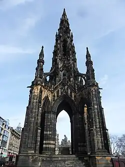 - 🌍 Scott Monument, East Princes Street Gardens EH2 2EJ, ☏ +44 131 529-4068. Daily 10-12:30AM, 2-4PM. Sir Walter Scott (1771-1832) re-invented Scotland. In the late Georgian era, he popularised tales of its medieval and Jacobean tumults, and created the clan tartans you buy on Princes St. This grand Gothic memorial, part cathedral part moon rocket, was completed in 1846 to dominate the east end of Princes St. It's 200 ft 6 in / 61.1 m tall, and guided tours take you up 287 steps (no lift) to the top platform, for a closer look at many of the statuettes of characters from Scott's works. The man himself and his dog sit in state at the base. In the 1990s the curators considered cleaning the monument but realised that the Victorian grime was holding it together, so replacement stonework is prominently white. Adult £8, child £6.