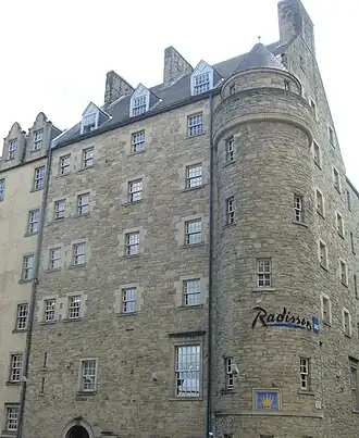 - 🌍 Radisson Blu Hotel, 80 High Street EH1 1TH (jcn of Royal Mile and North Bridge), ☏ +44 131 557-9797. Great location, comfort and service. The hotel was built in 1990, but with a retro-antique facade to blend with neighbouring buildings. B&B double £350.