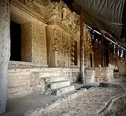 - El Trono (the throne) is the temple in which Ukit Kan Leʼk Tokʼ was buried. The doorway is in the shape of a monster-like mouth, possibly depicting a jaguar.