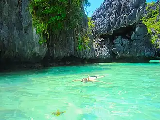 Breathtaking views of nature are the main reason to visit El Nido. The pristine waters of El Nido offer beautiful coral reefs, while its beaches are uncrowded unlike the popular Boracay, exploring the lagoons by kayaking is a great way of visiting the islets, coves and caves are also abundant. Inland El Nido, springs and waterfalls are also found. Bacuit Bay composes of limestone islands, where it's possible to either dive, snorkel or hike.
