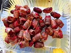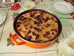 Elche's most well-known dish is arròs amb crosta (Spanish: arroz con costra), which is a clay pot of rice, rabbit and/or chicken, sausage, beans, and chickpeas, cooked first on a stovetop, and with the addition of beaten eggs then baked in an oven. Another unique specialty are the delicias de Elche, dates stuffed with almonds and wrapped with fried bacon, served as tapas in many bars and restaurants. For dessert the tortada de Elche, a cake of ground almonds, eggs, and meringue (and no flour) is a favourite.