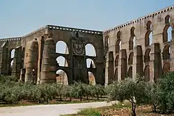 Elvas (EHL-vuhsh, /ˈɛɫ.vɐʃ/) lies on a hill 8 km (5.0 mi) northwest of the Guadiana river. The 6-km-long Amoreira Aqueduct supplies the city with pure water; it was begun early in the 15th century and completed in 1622. For some distance it includes four tiers of superimposed arches, with a total height of 40 m (130 ft).