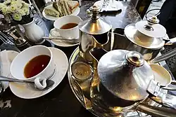 Tea is widely drunk throughout the country, almost always hot, usually strong, usually with milk, and quite often with sugar. There are many popular brands (the most recognisable brands are PG Tips and Tetley). Tea is usually drunk at home or at work or to accompany breakfast in inexpensive restaurants (where it will usually arrive with milk in a separate jug), or with afternoon tea (scones, cream, jam, and cakes) at a "tea-room" (less-frequently seen these days, except in expensive hotels or in holiday areas). It is often the cheapest drink in coffee shops. Tea is often served in pubs and bars too.