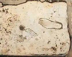 - The flat foot. A curious direction sign carved in the street outside the Nymphaeum. Its pictogram reveals that it was pointing the way to a brothel: the House of Pleasure lies that way, but there were others. (At Ephesus you only see the grand stone buildings along main drag, but this was just the nucleus of a sprawl of lesser structures, all the wooden or wattle shibeens, brothels, stables, livestock yards, hostels, workshops and humble dwellings that time has swept away.) The carving is thought to be from life, from someone with modern European shoe size 40, a middle toe longer than the big toe, and pes cavus or "flat foot" - maybe the Bawd or Madame? Various ribald interpretations are possible, one being that if your foot couldn't fill the carving, or if your money couldn't fill the adjacent notch, then the working girls didn't want your custom.