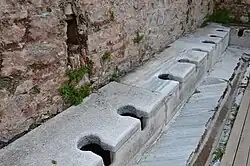 - 🌍 The latrines (Latrine and richly furnished insula). A compulsory photo stop, a splendid marble 48-seater by the Octagon. Only the residents of the Terrace Houses and a handful of other plutocrats had their own sanitary fittings. Everyone else had to use the communal crappers, of which this is the best preserved. It was roofed, and beneath the seats flowed spent water from the bathhouse. Backsides were cleansed with sponges on sticks - after use these were rinsed in the flow then dunked in vinegar to await the next customer. Analysis of the slurry showed that citizens were riddled with intestinal worms, disseminated from other human and animal backsides further up the food and water chain.