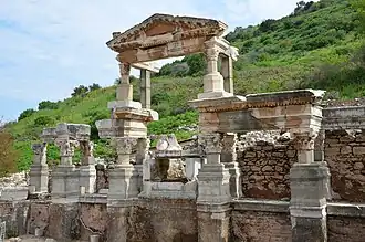 - 🌍 Fountain of Trajan (Trajan's Nymphaeum). A grand public fountain along this part of the street, astride the main water conduit; its statues have been moved to the Selçuk museum. The water system and fountain were erected from 102 AD by the initiative and personal expense of Claudius Aristion, as the inscription is at pains to have you know. The water was not only for washing and drinking but powered mills, including a sawmill for marble. Aristion at times held just about every great position in the city. He fell foul of political skulduggery but was rehabilitated and was sufficiently esteemed to be buried within the city.