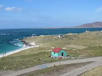 Eriskay is an island in the Outer Hebrides or Western Isles, linked by causeway to South Uist, and extending 3 miles north-south and 2 miles east-west. Its population in 2011 was 143, concentrated in the low-lying northwest corner, where the settlement is helpfully called Balla, "the village". The rest is rugged poor grazing.