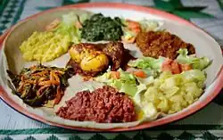 Eritrean cuisine in the highlands (around Asmara) consists largely of spicy dishes and is very similar to Ethiopian food. The staple is a flat, spongy crepe or bread called injera, made from a batter of fermented grains. Spicy stews with meat and vegetables are served on top of it and eaten with the hands. This cuisine is generally found in many restaurants in the country. Pork is rare as the Eritrean church forbids its followers from consuming pork.