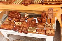 Essaouira's craftsmen are renowned for their woodwork and lacquerware. Intricately inlaid boxes, chessboards and curios can be found for good prices in the city's hundreds of shops; however, be aware that extensive deforestation is taking place in the area due to these woods not being replanted. Artwork of all kinds can be had here.