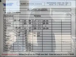 - 🌍 Gare routière, Avenue 2 Mars. Small and unappealing station which local buses depart from. Local buses from Marrakesh bus station cost 55-60 dirham but they might try to ask tourists for more, these buses are sometimes less comfortable and slower, but they depart more frequently than the CTM buses. Many ticket sellers and semi-touts are running around the buses and station, trying to organise your trip and luggage. Note, official prices are posted inside the terminal, so do not get told it is more expensive than that. Also be curious about any luggage fee—not common, especially for luggage on-board.