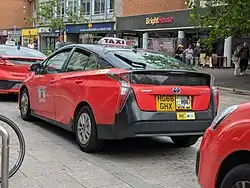 Taxi stands are located on the north-eastern intersection of the High Street and by Exeter St Davids station. Taxis can be flagged down if seen. They are in a distinctive red with the city coat of arms, with an illuminated "TAXI" sign and have yellow "Hackney carriage" plates on the rear of the vehicle next to the license plate.