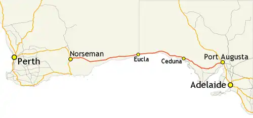 The Eyre Highway is the main road that connects South Australia with the south of Western Australia. It runs for 1668 km. from Port Augusta in the east to Norseman in the west.