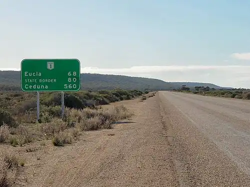 For much of its length, the Eyre Highway can be described as a long and lonely road. While in the East in South Australia you still find some small towns like Kimba, Wudinna and Ceduna with some fencing suggesting farmland the Western Australian side of the trip has little or no visible agriculture adjacent to the highway. What you will find are roadhouses, sometimes a mixture of a hotel, a caravan park and garage. Border Village, right at the border between South and Western Australia, and Eucla seem different but most of the stopping places are just plain dusty, with little to offer and of low interest. The mean distance between them is about 100 km, with the longest stretch being 190 km. (between Balladonia Roadhouse and Norseman). The stretch of road between Caiguna Roadhouse and Balladonia Roadhouse is known as the 90-mile straight. It's the longest stretch of straight road in Australia, 146.6 km of asphalt without a single curve! Towns east of Caiguna do not follow official Western Australian time. Instead, they use what is unofficially known as Central Western Standard Time, which is halfway between Western and Central time--UTC+8:45.