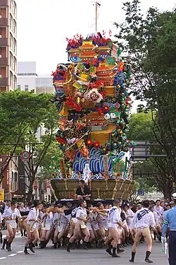 - Hakata Gion Yamakasa (博多祇園山笠). July 1–15. Fukuoka's second-largest festival, drawing up to a million spectators, is famous for the Oiyama parade float race. The elaborately-decorated yamakasa floats, around 5 m (16 ft) tall and weighing up to 1 tonne (1,000 kg), have no wheels; they're picked up and carried by teams of loincloth-clad men, each team representing one of the seven historic districts of Hakata. The race takes place on July 15; teams line up around 1AM, and at 4:59AM, drums signal teams to begin in 5-minute intervals. The 5-kilometer race takes about half an hour for the fastest teams. Much larger kazariyama floats, which are up to 13 m (43 ft) tall, are on display at street corners across the city, and are displayed indoors for the remainder of the year.