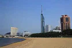 - 🌍 Fukuoka Tower (福岡タワー), Sawara-ku Momochihama 2-3-26. The triangular reflective tower has magnificent views of the city and Hakata Bay from its 123-meter-high observation deck. (The whole tower is 234 m; the remaining 111 m is a television mast.) In Christmas and the Star Festival (Tanabata) on July 7, this tower is decorated. During the rest of the year the view is best at night time. This is an iconic symbol of Fukuoka. There is a restaurant which commands a ¥300 sitting fee in addition to the meal. The menu is limited and the food is mediocre at best. ¥800.