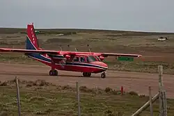 Travelling between islands in the Falklands is generally done using the Falkland Islands Government Aviation Service (FIGAS). The planes are Britten Norman Islander aircraft, capable of carrying eight passengers plus pilot. Passenger load may be reduced depending on the condition of the airstrips being visited. With the exception of Stanley and Mount Pleasant, all airstrips in the Falklands are either dirt strips or grassy fields. Be prepared for slight delays while livestock is cleared from airstrips prior to takeoff or landing!