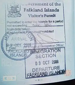 Visas can be obtained from a British embassy or consulate, or, if you are in the UK, the Falkland Islands Customs and Immigration Department, ☏ +500 27340. Keep in mind that Falkland Islands visas are separate from those for the UK, and having a UK visa will not allow you to visit the Falkland Islands.