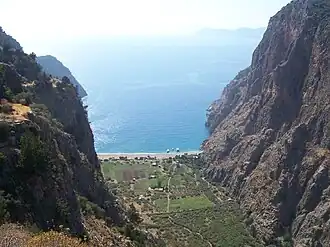 Faralya is a village in Lycia on the Mediterranean coast of Turkey, 15 km south of Ölüdeniz and 30 km south of Fethiye. It's best known for Butterfly Valley, a scenic canyon. Officially it's called Uzunyurt, which refers to the straggle of settlements comprising Kozağaç, Kirme, Hisar, Faralya, Kızılcakaya and Kabak (separately described). Nobody calls it that, but the name is apt, as it means “straggle of settlements, et cetera, et cetera”. The strip around Faralya had a population of 640 in 2022.