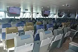 Once aboard: there may be open luggage racks as on trains, or coin-operated lockers, or a secure room. Seating is often assigned on hydrofoils but finders-keepers on conventional ships: you're trying to finesse the best views, the least draughts and smells, and the least objectionable neighbours. If you've booked a cabin, old school you collect the key from a purser in a peaked cap, but modern ships may adopt the style of a hotel reception lobby; or you may simply have a room access code on your ticket, to key in or get scanned by the lock.