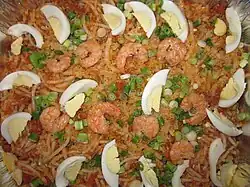 - Pancit palabok - boiled noodles, topped with achuete (annatto seeds), shrimp, and crushed crunchy fried pork.