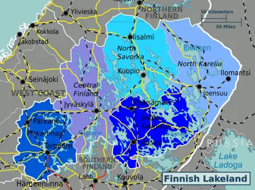 As the name reveals it is a land of lakes: seen from above, the region consists of an endless patchwork of lakes and low rolling hills, originally gouged out by sheets of ice during the Ice Age. This also makes it Finland's top destination for summer cottages, and there are countless spots to indulge in the Finnish national obsession for sauna, sausages and a dip in the lake. It is also one of the destinations popular by tourists, so there are many businesses eager to take care of you – but most of the area is off the beaten path, with small towns and villages and hundreds of kilometres of desolate shoreline.