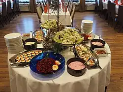 The Finnish word for buffet is seisova pöytä ("standing table"), and while increasingly used to refer to budget all-you-can-eat restaurants, the traditional meaning is akin to Sweden's smörgåsbord: a good-sized selection of sandwiches, fish, meats and pastries. It's traditionally eaten in three rounds: first the fish, then the cold meats, and finally warm dishes – and it's usually the first that is the star of the show. Though expensive and not very common in a restaurant setting, if you are fortunate enough to be formally invited to a Finn's home, they might have prepared a spread for their guests, along with plenty of coffee. Breakfast at better hotels is also along these lines and it's easy to eat enough to cover lunch as well!