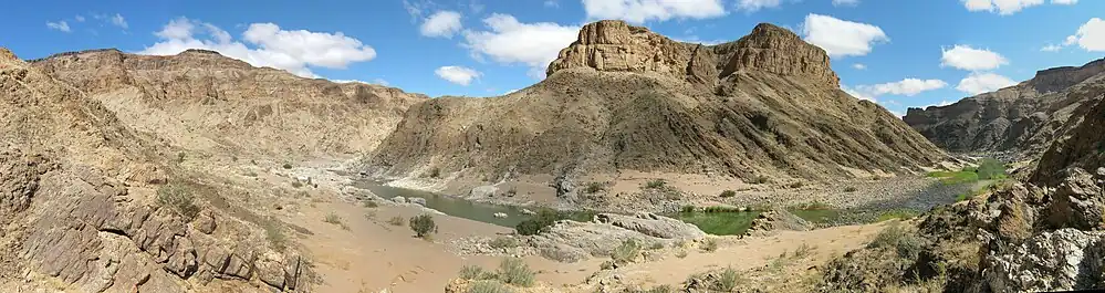 The Fish River has its source in the Eastern Naukluft Mountains and in Richtersfeld flows into the Orange River, after travelling for more 650 km through the desert of Southern Namibia. In its lower part (between Seeheim and Ai-Ais) it crosses a mountain range and thereby forms the Fish River Canyon. Today nearly all of the Canyon is preserved by nature reserves: in the south where the deepest part is located by the Ai-Ais/Richtersveld Transfrontier Park, in the north by private nature reserves such as the Canyon Nature Park or Vogelstrausskluft.