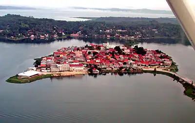 Flores is a town in Petén, Guatemala. The town proper is an island on Lago Petén Itzá (la isla), connected to land by a causeway (el puente), on the other side of which lie the twin towns Santa Elena and San Benito. All three are often referred to as Flores, and are grouped in one article here accordingly.