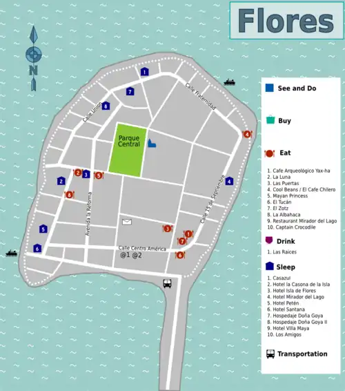 - Hotel Isla de Flores, Avenida la Reforma, Ciudad Flores Petén, ☏ +502 7867 5176, hotelisladeflores@gmail.com.