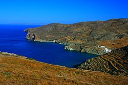 Folegandros is a barren island with a rocky coastline and almost sheer cliffs. Main settlements are the port of Karavostasi, the capital of the island, the "Chora", built on the edge of a cliff overlooking the northern coast and the windswept village of βAno Meriaβ. Only the beaches of Agali and Karavostasi bays can be reached by car. π Katergo is a secluded beach and can only be reached by boat or an hour long hiking from Livadi campsite.