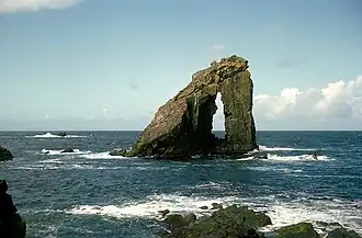 - 🌍 Gaada Stack is a sea-arch off the north tip of Foula, looking like a Titan's travel iron. A lane leads here to the settlement of Da Nort Toons, so it's an approachable stretch of coastline. It's not to be confused with Gaada stacks the low pierced islets off Vaila.