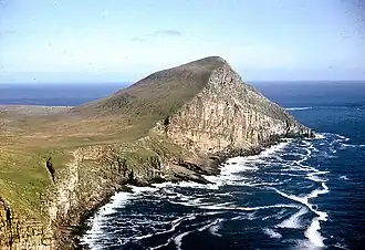 Foula is roughly pear-shaped, 3.5 miles long by 2.5 miles wide. A lane runs along the east side, which has farmland and the main settlement and ferry landing at Ham. The west is heath and peat bog, rising to five hills: Da Noup in the south and four grouped in the north. These end in great sea-cliffs swirling with bird life, while waves dash against stacks and arches. The hills draw the mist and cloud, unlike the low-lying Mainland, and when snow falls Foula from the ferry looks like a huge iceberg.