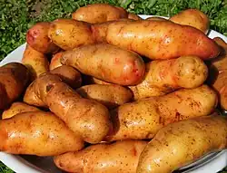 Bamberger Hörnla. are one of the oldest German potato varieties, officially registered in Franconia since 1854, not to be confused with the traditional yeast pastry of the same name. The potatoes are small and have a crooked, elongated shape. Since they are firm, they are particularly suitable for potato salad. The potato variety can be bought at weekly markets and in shops with local products, in supermarkets or outside Franconia they are difficult to find..