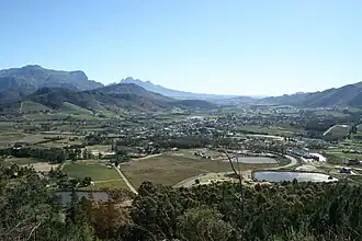Franschhoek (Dutch for 'French Corner') is a city in the Cape Winelands. Franschhoek makes a serious attempt at being the food and wine capital of South Africa and there are many fine restaurants. It's a great place to relax, enjoy top food and wine, in a spectacular atmosphere.