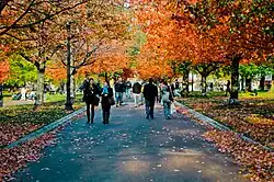 Today the park is an association of sites ranging from steepled churches, grand meeting halls, and battlegrounds to America's oldest commissioned warship. The park is distinctive, mixing historic buildings and landscapes owned by the city, the state, the federal government, and private organizations. The Freedom Trail is a 2.5 mile walking trail of 16 colonial, Revolutionary, and federal sites in downtown Boston and Charlestown that tells the story in four principle chapters of the people, places, and events that sparked the American Revolution against England and highlights Boston's role in laying the foundation for a new nation.