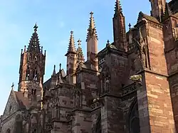 - 🌍 Freiburg Minster (Münster Unserer Lieben Frau), Münsterplatz 1, ☏ +49 761 208 59 63, info@c-punkt-freiburg.de. M-Sa 10:00-17:00; public holidays and Su 13:00-19:30. The cathedral is Freiburg's biggest sight in the city, one of the oldest and most beautiful in all of Europe. The gargoyles are not to be missed - be sure to study every corner of the Munster. Make the effort to climb to the top of the tower for the fabulous views (€5) - the entrance is to the side and the cashier is at the top of about 200 stairs. Guided tours are offered, but check the website for more details (also check to see when the cathedral is closed to the public). M-F mornings until 13:00 and Sa until 13:30, there is a market on the square surrounding the church. Visit on Saturday morning, as it then will be the biggest and nicest. Vendors are pleasant and sell local produce and goods. Buy a Bratwurst mit Brötchen (Bratwurst in a bun) or Currywurst for around €3.50. It will be an inexpensive, authentic, and delicious lunch or snack.