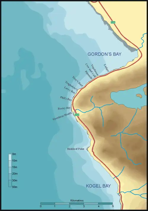 This area includes some of the best and most popular shore dive sites in the east side of False Bay. All can also be dived from a boat, and this is of particular importance to divers with restricted mobility on shore, as there is generally a rugged bit of coast to negotiate and in some cases a long climb. There are also sites which are only dived from boats as the shore access is too difficult or dangerous. The dive sites are all close inshore, as sand bottom is quite close to the shore in most cases, There is little or no kelp at these sites.