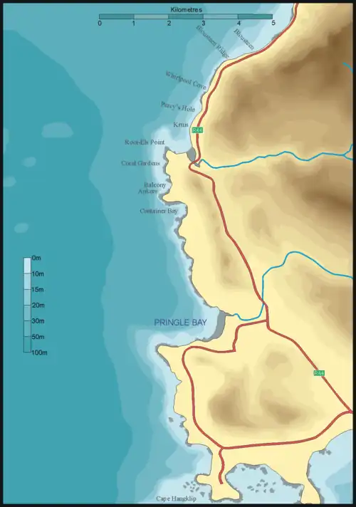 This listing of dive sites of False Bay east coast is part of the regional guide for Diving the Cape Peninsula and False Bay which is intended to provide the already qualified scuba diver with information which will help to plan dives in the waters of the Cape Peninsula and False Bay, whether as a local resident or a visitor. Information is provided without prejudice, and is not guaranteed accurate or complete. Use it at your own risk. Expand or correct it when you can.