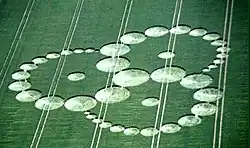 Crops circles are patterns that can appear in fields of crops, typically formed by the flattening of the crop within the nominal pattern. The patterns can range from simple circles to complex geometric figures or fractals. Various explanations including localised weather, mycology, and human causation have been suggested.