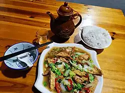 - 🌍 Small Stream Bridge Restaurant (小桥流水餐馆), 塔下村61号(雪英桥往河上游10米) (Near the stream in Taxia), ☏ +86 596 7771462. 07:00-23:00. This place offers local food, reasonable prices and nice views over the stream crossing Taxia village. Favorites are chicken soup, boiled eggplant and fried bamboo shoots (that might be strange to the Western taste) ¥45 per person.