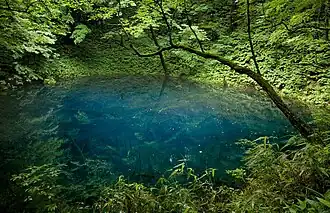 - Blue Pond (青池). This is the most popular pond in the "12 Lakes" (十二湖 Jūniko) area of the city on the edge of the Shirakami-Sanchi. As the name suggests, it's known for its vibrant blue color. In the autumn, people say that the yellow leaves that fall on the lake look like gold-leaf on blue porcelain.