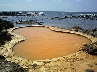 - Furofushi Onsen (不老ふ死温泉 Furōfushi Onsen). The daytripper fee gives you access to three different onsen, however, they have different hours of operation, so pay attention to their hours. The Kogane no Yu (黄金の湯) open from 09:00-17:00 located in the Honkan features 2 indoor baths of different temperatures. There are large glass panels with views of the sea. The Furofushi no Yu (不老ふ死の湯) located in the Shinkan has the most facilities, with a sauna, cold baths, and indoor onsen as well as an open-air outdoor onsen with a full, unobstructed view of the Sea of Japan. The Umibe no Rotemburo (海辺の露天風呂) open from 09:00-16:00 is a fully open-air onsen located right by the Sea of Japan. Pictures of Furofushi Onsen nearly always feature this onsen with its caramel-brown color contrasting the blue of the sea and sky beyond it. This bath features women-only and mixed-sex baths. There are special bathing suits for women available for ¥400 (free for staying guests) for use in these baths. All of the waters of Furofushi Onsen are iron springs. It is said that the water here is particularly good for healing cuts and wounds, as well as being good for the skin. The information here is for daytrippers. For information about staying overnight, see "Sleep" section. ¥1000.