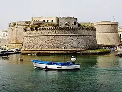 - π Angevin-Aragonese Castle (Castello angioino-aragonese), Riviera Armando Diaz, β +39 0833 262775. 10:00-00:00. A wooden drawbridge permits the entry to this imposing defensive structure of the 11th century, rebuilt and restored several times. It is border by the sea on three sides, while the semi-circular bastion, overlooking the modern centre, is completely surrounded by the waters of the Seno del Canneto (Cove of the Cane field).