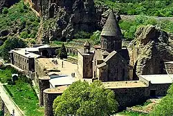 - 🌍 Geghard monastery (5 km east of Garni. Minibuses run to Goght, or a return taxi with one hour wait might be 3,000 dram.). Revered 11th C monastery, much of it carved out of the solid stone of the mountainside, in dramatic canyon setting. Monastery and canyon are a UNESCO World Heritage site. The fortified compound encloses the main church, holy springs, an upper chamber with unparalleled acoustics and many intricate khachkars. The "Geghard" was supposedly the Roman spear that pierced Jesus' side; this relic was long housed here but is now in Echmiadzin.
